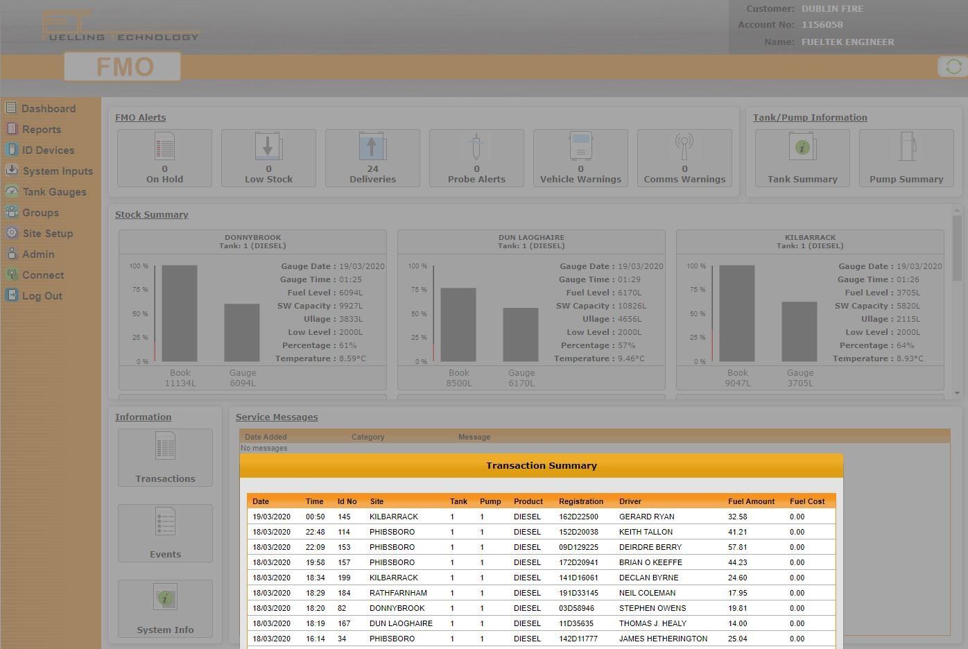 Fueltek have designed and developed FUELTEK FMO (Fuel Manager Online) - online fuel management software that predominately deals with the FT4000 range and dispensing pump interfaces, and provides transaction information on pump throughputs. Fueltek FMO can provide stock information using a book stock, also known as theoretical stock, with pump throughputs being deducted from an opening stock figure to give a current stock value.
